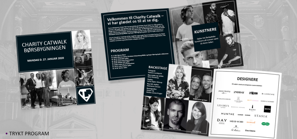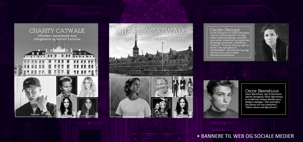 Charity Catwalk Visuel stil til indsamlingsshowet Charity Catwalk, hvor kendte modeller går catwalk til fordel for Legeheltene. Til kampagnen har jeg lavet webbannere, SoMe bannere til kampagnen og modeller/kunstnere, samt pressevæg og trykt program til deltagere.